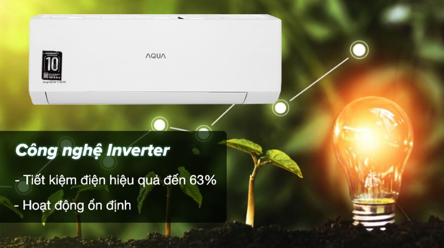 Công nghệ Inverter: Giúp điều hòa Aqua 1 HP này vận hành êm ái và có thể hoạt động với dải điện áp rộng từ 130 - 264V, đồng thời mang lại hiệu quả tiết kiệm đến tận 63%.