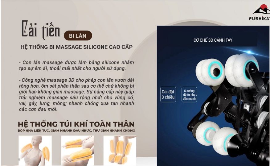 Hệ thống túi khí toàn thân nhằm tăng cường bóp nhả liên tục, hỗ trợ giảm đau nhức nhanh chóng, thư giãn tối đa cho cơ bắp, giúp người dùng tận hưởng cảm giác dễ chịu, thoải mái. Hệ thống túi khí thiết kế vùng vai, cánh tay, bắp chân và mu bàn chân kết hợp với bi lăn massage giúp massage chuyên sâu.