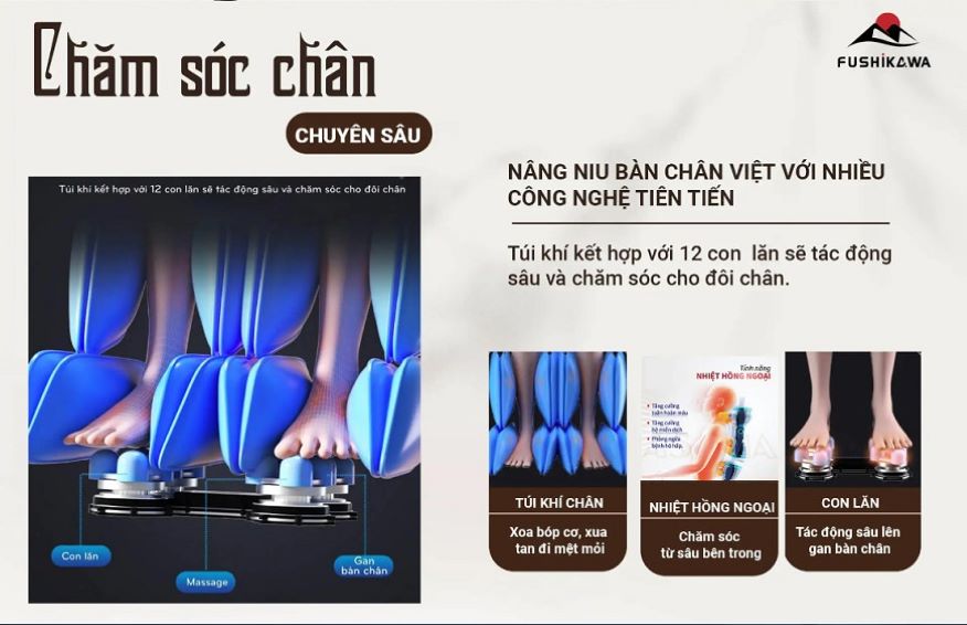 Sản phẩm có tính năng nổi bật giúp nâng niu bàn chân với các công nghệ tiên tiến. Túi khí cơ, kết hợp với 12 con lăn sẽ tác động sâu lên gan bàn chân và chăm sóc cho đôi bàn chân của bạn, xóa tan đi mọi mệt mỏi ở chân.