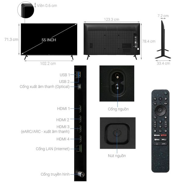 - Màn hình 55 inch phù hợp để trưng bày trong không gian phòng khách, phòng ngủ hay cả phòng khách.