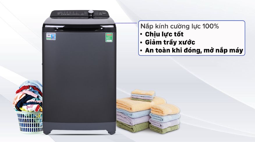 Máy giặt Aqua được trang bị nắp kính cường lực 100% có thể chịu được những tác động mạnh bên ngoài, hạn chế trầy xước để máy giặt luôn như mới, an toàn khi đóng, mở nắp máy.
