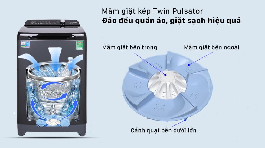 Mâm giặt kép Twin Pulsator đảo áo quần thấm đều bột giặt, tăng hiệu quả giặt sạch