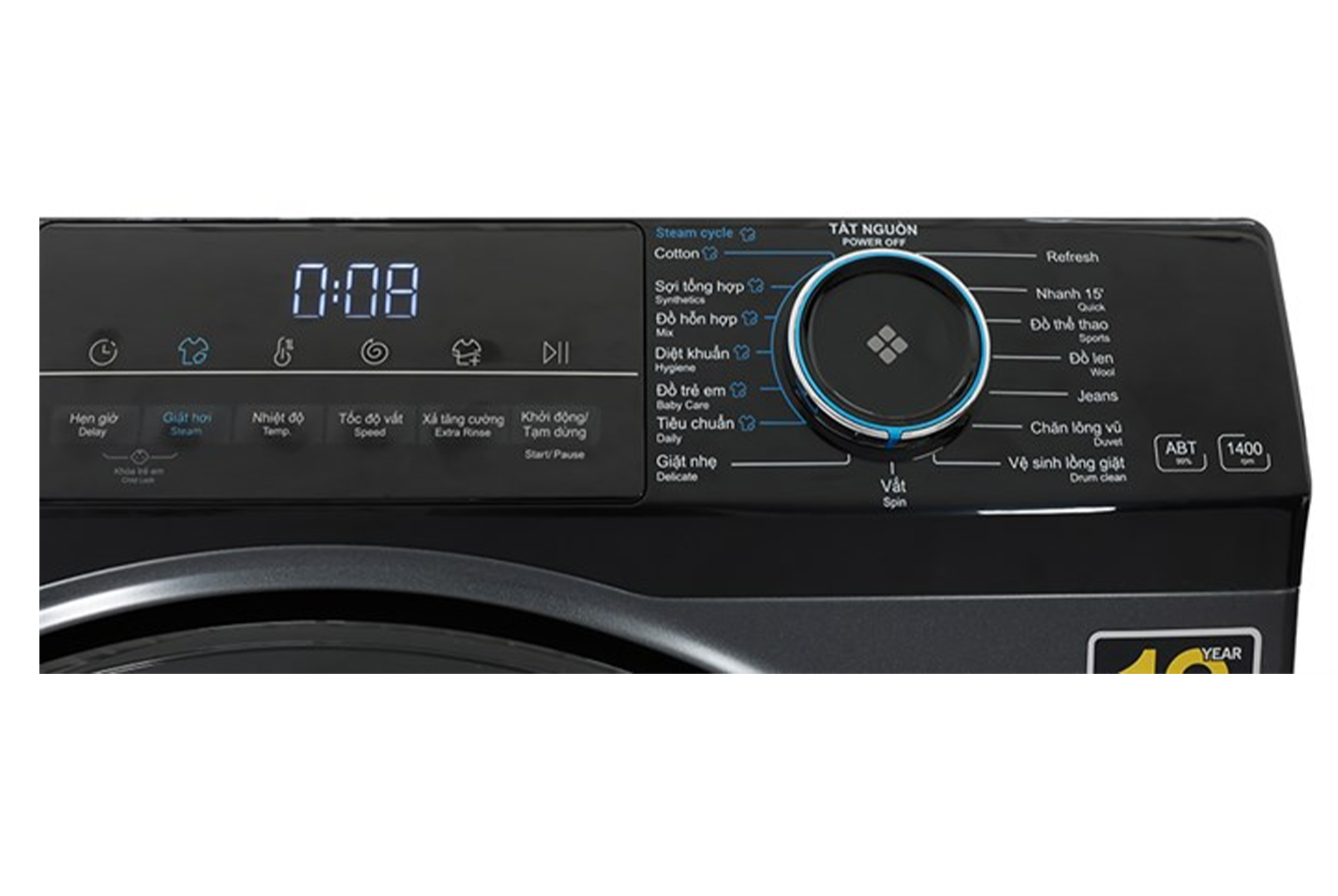 - Bảng điều khiển song ngữ Anh - Việt kết hợp cùng núm xoay điều khiển cùng nút nhấn có màn hình hiển thị rõ ràng, dễ hiểu giúp cho việc giặt giũ trở nên dễ dàng hơn.