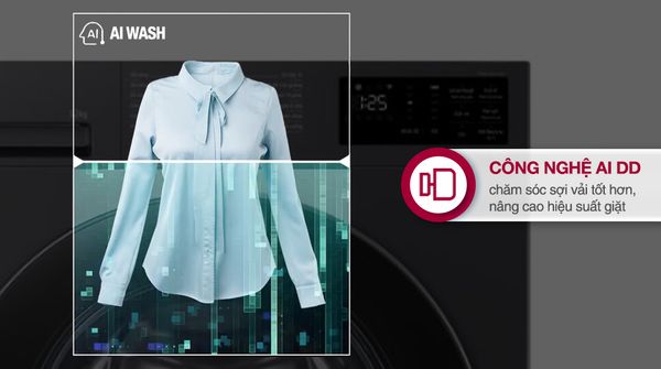 Công nghệ AI DD bảo vệ sợi vải giúp máy nhận biết khối lượng và chất liệu sạch, từ đó điều chỉnh chuyển động làm sạch phù hợp để làm sạch hiệu quả và hạn chế hoạt động mạnh lên sợi vải.