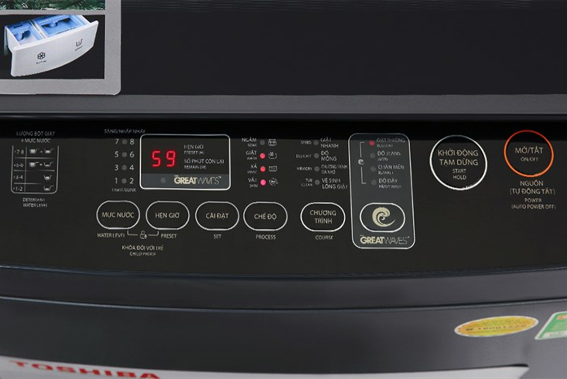 - Công nghệ Greatwaves: với sự kết hợp 3 luồng nước cùng các tia nước tạo ra từ lỗ phun của máy giặt Toshiba, thiết bị kiến tạo luồng nước siêu mạnh giúp phân tách quần áo, chống xoắn rối, loại bỏ vết bẩn, cặn xà phòng, giúp giặt sạch và bảo vệ chất liệu vải.
