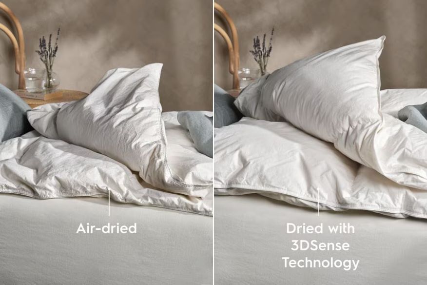 Công nghệ sấy 3DSense tiên tiến nhất của chúng tôi và cũng là công nghệ sấy hàng đầu trên thị trường hiện nay, sẽ quét sâu độ ẩm trong từng lớp quần áo, đảm bảo sấy khô hoàn toàn và chính xác. Áo khoác lông vũ sẽ được giữ như mới, và độ phồng sẽ phục hồi 100%.** Ngoài ra, thử nghiệm trên chăn bông cũng chứng minh khả năng sấy khô hoàn hảo, không để lại vết ẩm nhờ công nghệ sấy này.