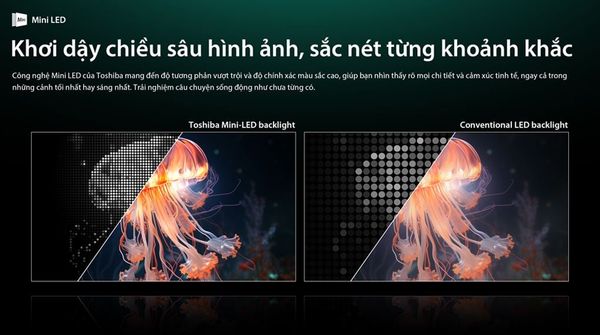 Tivi Toshiba sử dụng đèn nền Mini LED kết hợp tấm nền IPS LCD, giúp kiểm soát vùng sáng và cải thiện độ tương phản trong nhiều điều kiện hiển thị. Công nghệ Quantum Dot Color hỗ trợ tái tạo dải màu rộng, mang lại hình ảnh có độ chính xác cao hơn.
