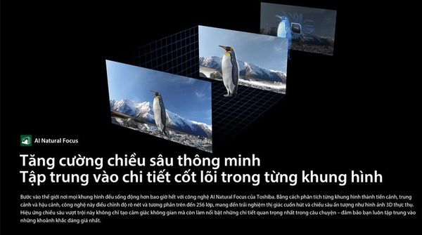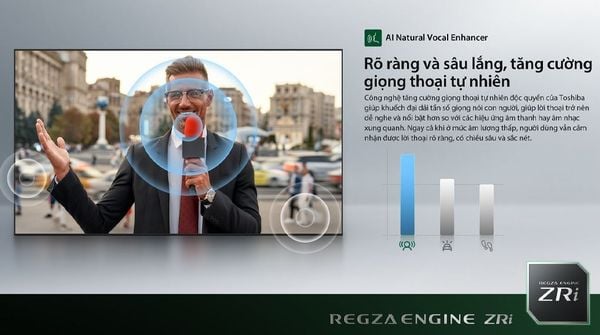 Các công nghệ như AI Natural Vocal Enhancer giúp làm rõ lời thoại, 360 Surround Upscaling mở rộng không gian âm thanh và Regza Bass Woofer tăng cường dải âm trầm. Real Sound Adjuster hỗ trợ tinh chỉnh âm thanh phù hợp với từng nội dung, giúp trải nghiệm nghe ổn định hơn.