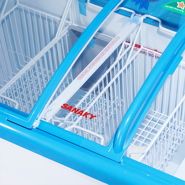 Cánh lùa Tủ Đông Sanaky VH-482K thiết kế bởi 2 cánh kính cường lực được phủ lớp phản xạ không hấp thụ nhiệt giảm khả năng thoát nhiệt