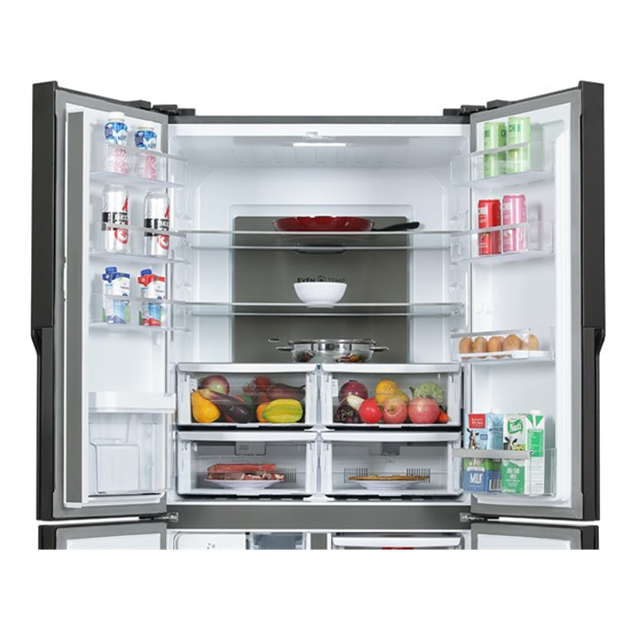- Công nghệ làm lạnh đa chiều: Cửa thoát hơi lạnh được bố trí đều mỗi ngăn và thổi luồng khí lạnh theo hình vòng cung. Từ đó giúp làm lạnh thực phẩm toàn diện và giảm thiểu tình trạng ôi thiu thực phẩm do tránh được tình trạng phân bổ khí lạnh không đồng đều giữa các ngăn chứa.
