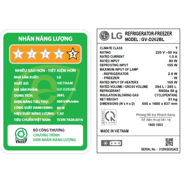 - Nhãn năng lượng 5 sao, công suất tiêu thụ công bố theo TCVN tương đương 0.99 kW/ngày.
