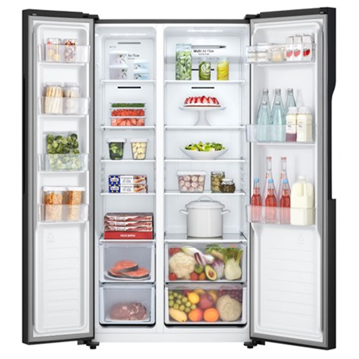 - Thuộc dòng tủ lạnh Side by side, chất liệu cửa tủ được làm từ thép không gỉ bền đẹp với thời gian, màu đen sang trọng phù hợp với nhiều kiểu thiết kế nội thất.