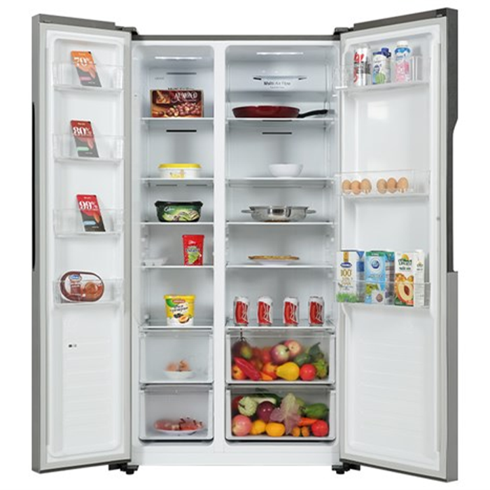 - Dòng tủ lạnh Side by Side, chất liệu cửa tủ được làm từ thép không gỉ bền chắc với màu bạc tinh tế, hòa hợp với mọi không gian nội thất.