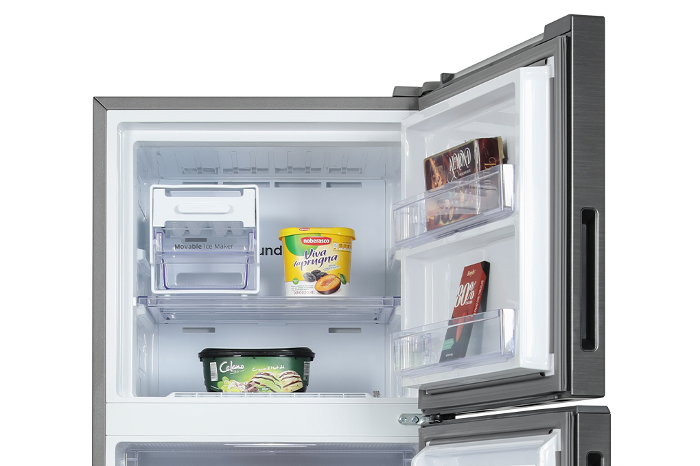 - Tích hợp khay làm đá xoay có thể linh hoạt nhiều vị trí trong tủ tối ưu không gian trữ đồ.