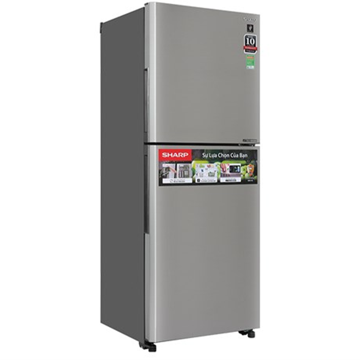 - Tủ lạnh SJ-XP352AE-SL thuộc kiểu tủ ngăn đá trên với 2 cửa quen thuộc, cửa tủ bằng thép không gỉ với tông xám, có độ bền cao, không bị bám bụi và dễ vệ sinh. Tổng quan tủ khá vuông vức và hiện đại khi đặt trong không gian bếp, phòng ngủ hoặc phòng khách.